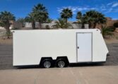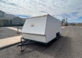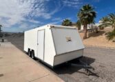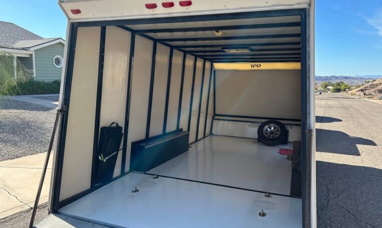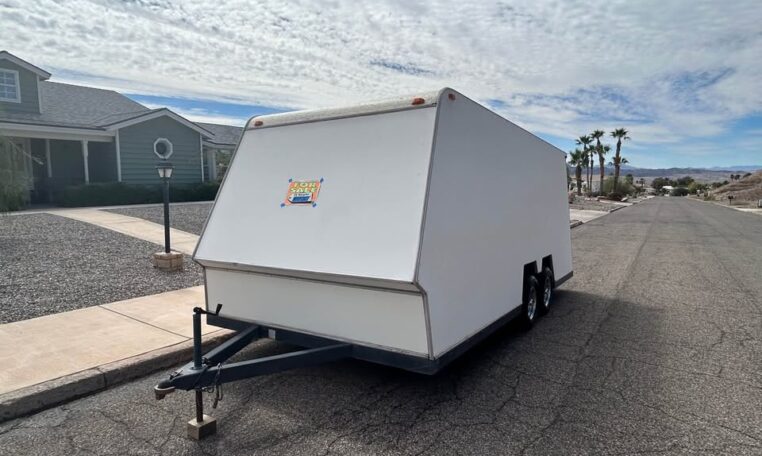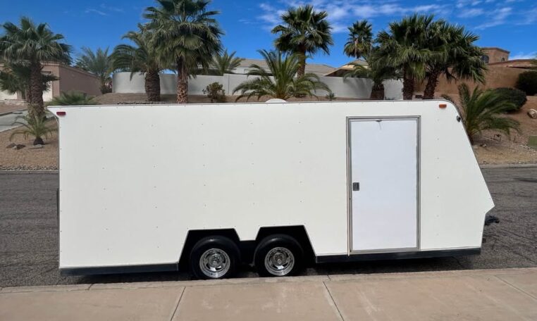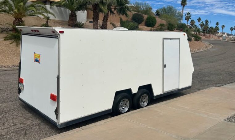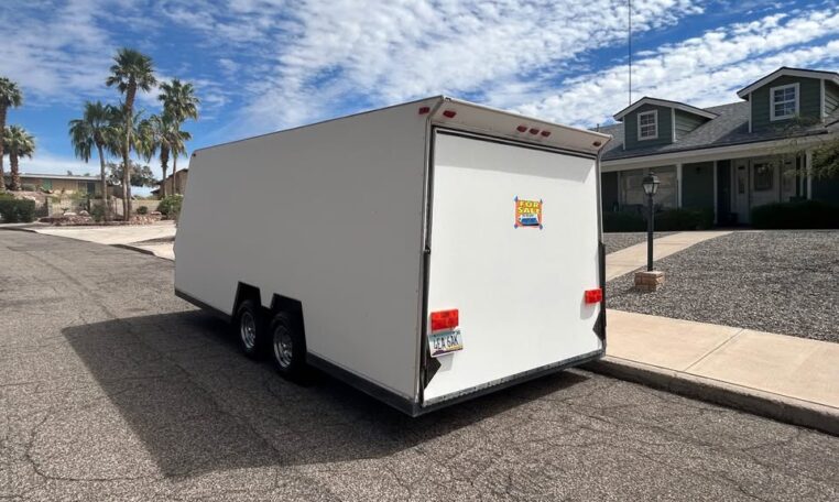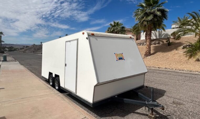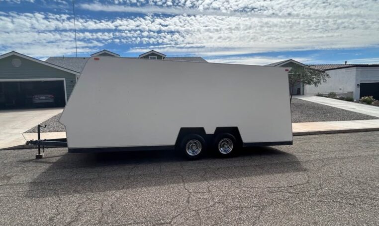 1986 TPD enclosed trailer. 18ft, hidden beaver tail. Rear opening is 88″ wide at bottom, 78″ at top, 72″ tall, and 77 1/2″ between wheel wells. In excellent shape for its age. Pulls straight and never abused. Tires were replaced May 2025. Trailer does need electric brake control. $8500 in Lake Havasu City, AZ.