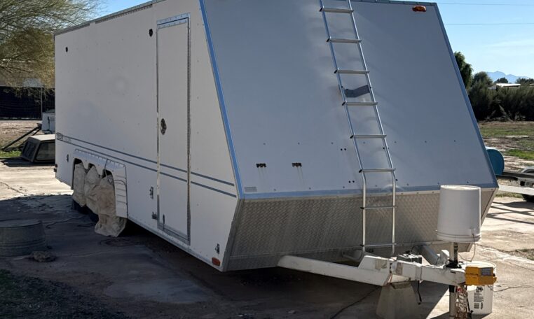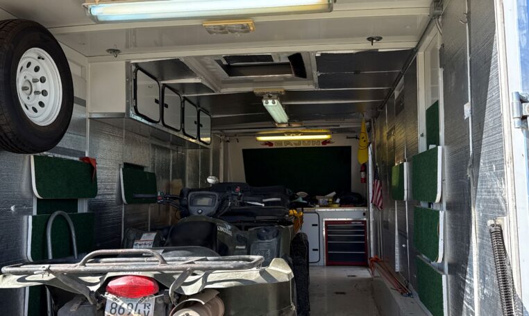 24′ enclosed triple axle enclosed trailer. Power tongue jack, 15 ‘ awning. flood lights, slide out drawer with a champion generator. Interior counter at the nose with a craftsman locking toolbox. 110 power with interior outlets and ceiling lights. Side cabinets and fold down shelves to hold your gear when out riding. Heavy duty ramp with additional flood lights. Interior spare tire mount. We installed interior insulation between the studs. There are built in floor tie downs with the straps for car hauling. This is a great trailer for hauling cars, quads or just to place on your property for additional storage shed with no increase in your property tax. Call for additional information or pictures.